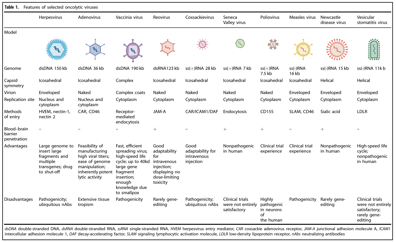 不同溶瘤病毒的特征(表格来源:Lin D et al, Signal Transduct Target Ther., 2023)