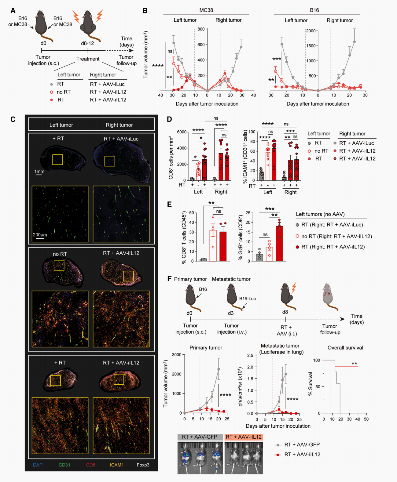 FAS/FASL通路是关键执行环节:放疗+AAV-iIL12能诱导肿瘤细胞高表达FAS,同时激活CD8⁺T细胞、NK细胞表达FASL,通过FAS/FASL结合诱导肿瘤细胞凋亡;阻断FASL后,疗法的抗瘤效果显著减弱;