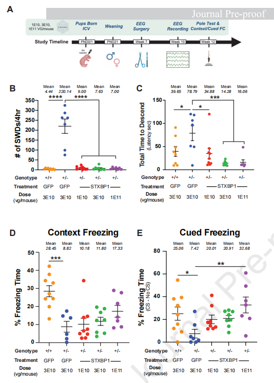 该研究选用Stxbp1+/-小鼠作为疾病模型。该模型能够高度再现人类患者的关键病理表型,包括皮层过度兴奋(脑电图表现为棘慢波放电,SWDs)、运动功能障碍和认知受损。