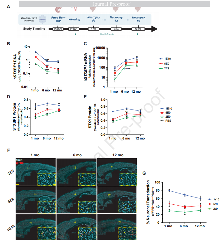 组织级表达:AAV-PHP.B-hSyn-STXBP1治疗在小鼠皮层中引起了DNA载体分布、转基因mRNA水平的剂量依赖性增加(图1B, 1C)。总STXBP1蛋白及药效学标志物STX1蛋白也呈现剂量依赖性上升(图1D, 1E)。