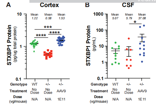 图6 AAV9-hSyn-STXBP1可提升Stxbp1杂合缺陷小鼠脑脊液中STXBP1蛋白水平