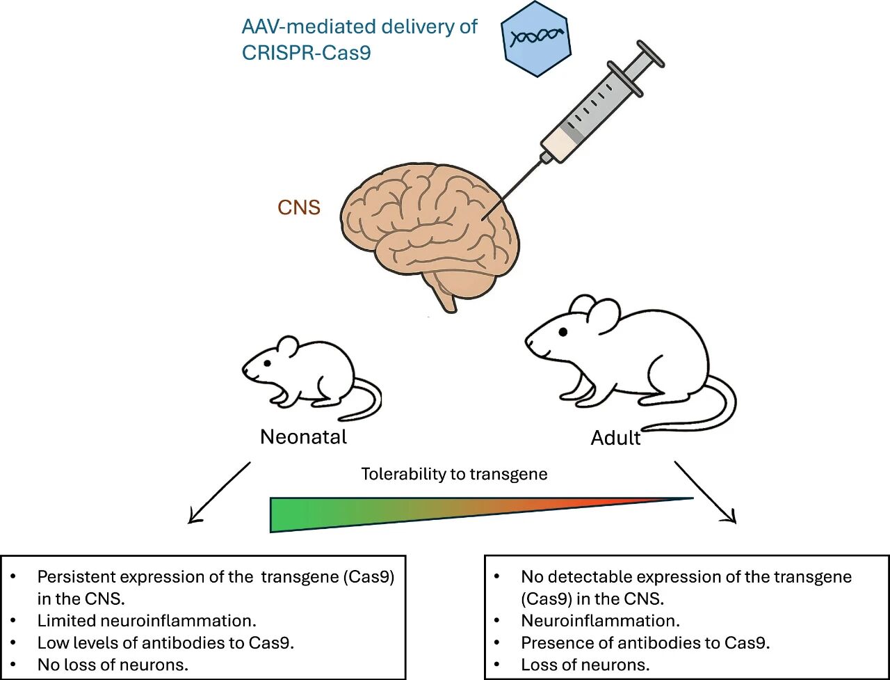 AAV介导的基因疗法在治疗CNS疾病(以及其他获得性或遗传性疾病)方面展现出巨大潜力,但免疫反应,尤其是针对外源性CRISPR-Cas组分(如Cas9)的免疫反应,构成了重要的挑战,尤其是对于成人患者。早期或新生儿给药有助于克服这些挑战,实现持久表达并最大限度地降低免疫原性,从而为更安全、更有效的基因编辑疗法铺平道路。