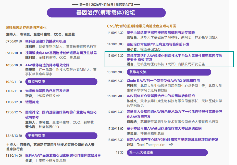 劲帆医药研发总监潘杏将于4月16日下午15:00-15:30在基因治疗(病毒载体)论坛,带来“高纯度、高活性AAV规模化制造技术平台助力系统性用药基因疗法更安全、有效、可及”的主题报告。